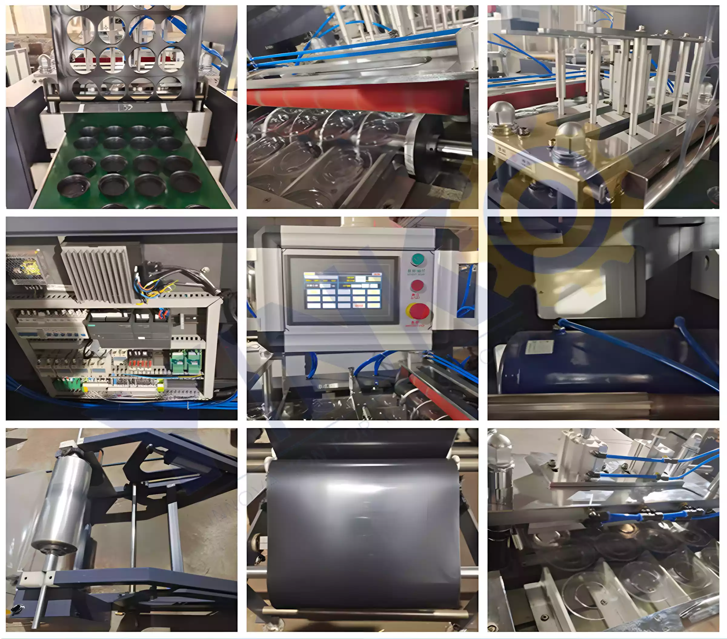 This machine is designed for automatic thermoforming of plastic cup lids, using PVC, PET, HIPS, and PLA sheets.